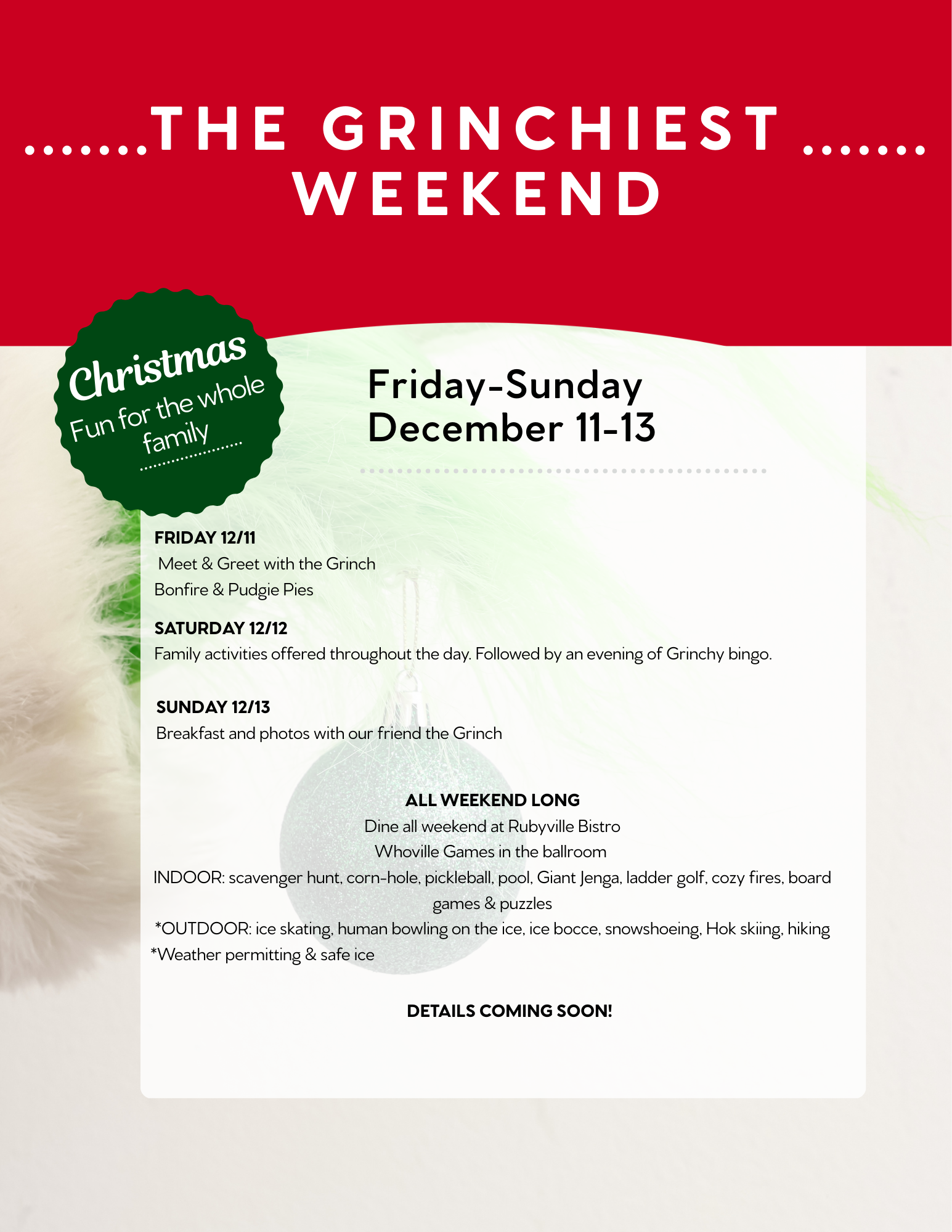 Family activities offered throughout the day. Followed by an evening of Grinchy bingo.